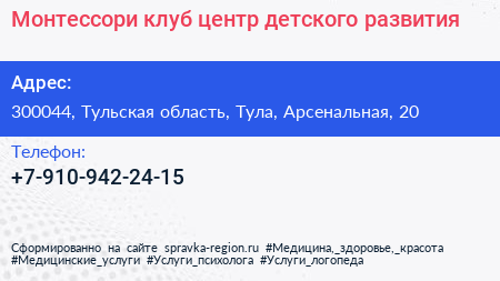 Монтессори клуб, центр детского развития по адресу 300044, Тульская область, Тула, Арсенальная, 20 в дальнейшем Организация, размещена в следующих категориях: