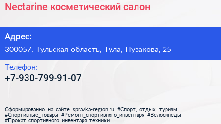 Nectarine, косметический салон по адресу 300057, Тульская область, Тула, Пузакова, 25 в дальнейшем Организация, размещена в следующих категориях: