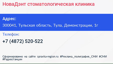 НоваДэнт, стоматологическая клиника по адресу 300041, Тульская область, Тула, Демонстрации, 1г в дальнейшем Организация, размещена в следующих категориях: