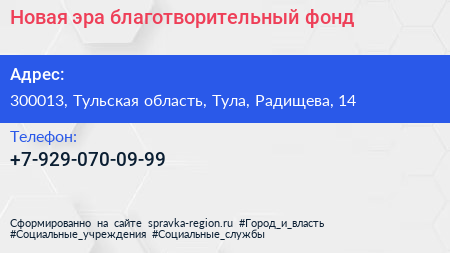 Новая эра, благотворительный фонд по адресу 300013, Тульская область, Тула, Радищева, 14 в дальнейшем Организация, размещена в следующих категориях: