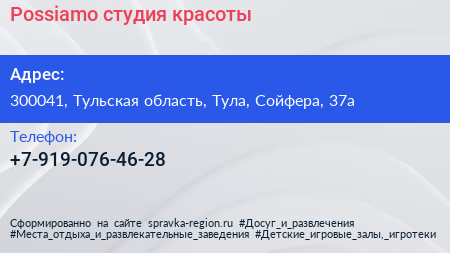 Possiamo, студия красоты по адресу 300041, Тульская область, Тула, Сойфера, 37а в дальнейшем Организация, размещена в следующих категориях: