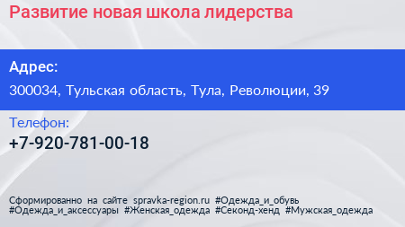 Развитие, новая школа лидерства по адресу 300034, Тульская область, Тула, Революции, 39 в дальнейшем Организация, размещена в следующих категориях: