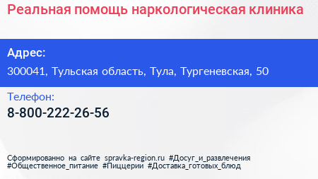 Реальная помощь, наркологическая клиника по адресу 300041, Тульская область, Тула, Тургеневская, 50 в дальнейшем Организация, размещена в следующих категориях: