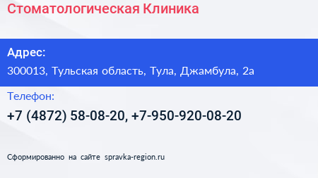 Стоматологическая Клиника по адресу 300013, Тульская область, Тула, Джамбула, 2а в дальнейшем Организация, размещена в следующих категориях: