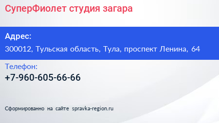 СуперФиолет, студия загара по адресу 300012, Тульская область, Тула, проспект Ленина, 64 в дальнейшем Организация, размещена в следующих категориях: