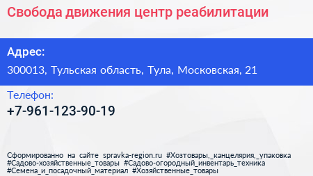 Свобода движения, центр реабилитации по адресу 300013, Тульская область, Тула, Московская, 21 в дальнейшем Организация, размещена в следующих категориях: