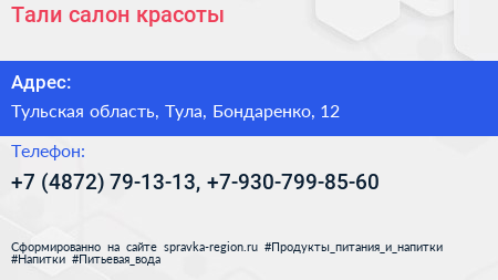 Тали, салон красоты по адресу Тульская область, Тула, Бондаренко, 12 в дальнейшем Организация, размещена в следующих категориях: