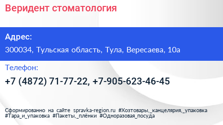 Веридент, стоматология по адресу 300034, Тульская область, Тула, Вересаева, 10а в дальнейшем Организация, размещена в следующих категориях: