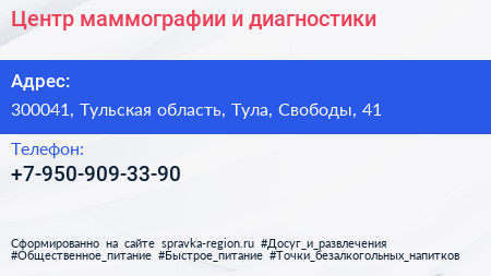 Центр маммографии и диагностики по адресу 300041, Тульская область, Тула, Свободы, 41 в дальнейшем Организация, размещена в следующих категориях: