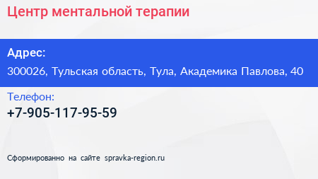 Центр ментальной терапии по адресу 300026, Тульская область, Тула, Академика Павлова, 40 в дальнейшем Организация, размещена в следующих категориях: