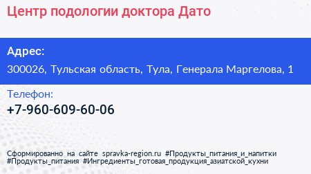 Центр подологии доктора Дато по адресу 300026, Тульская область, Тула, Генерала Маргелова, 1 в дальнейшем Организация, размещена в следующих категориях: