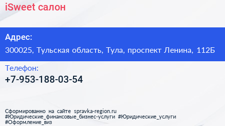 iSweet, салон по адресу 300025, Тульская область, Тула, проспект Ленина, 112Б в дальнейшем Организация, размещена в следующих категориях: