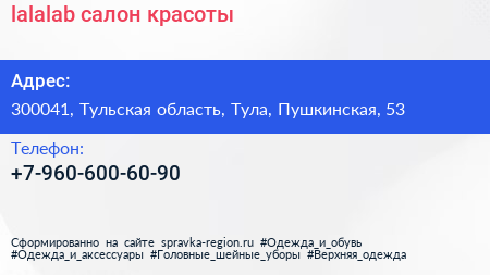 lalalab, салон красоты по адресу 300041, Тульская область, Тула, Пушкинская, 53 в дальнейшем Организация, размещена в следующих категориях: