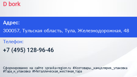 D-bork по адресу 300057, Тульская область, Тула, Железнодорожная, 48 в дальнейшем Организация, размещена в следующих категориях: