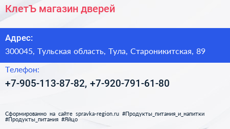 КлетЪ, магазин дверей по адресу 300045, Тульская область, Тула, Староникитская, 89 в дальнейшем Организация, размещена в следующих категориях: