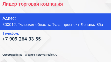 Лидер, торговая компания по адресу 300012, Тульская область, Тула, проспект Ленина, 85а в дальнейшем Организация, размещена в следующих категориях: