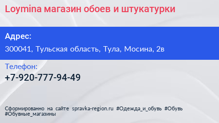 Loymina, магазин обоев и штукатурки по адресу 300041, Тульская область, Тула, Мосина, 2в в дальнейшем Организация, размещена в следующих категориях: