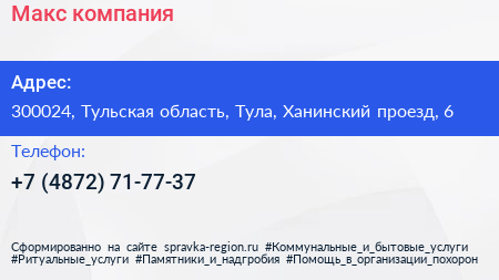 Макс, компания по адресу 300024, Тульская область, Тула, Ханинский проезд, 6 в дальнейшем Организация, размещена в следующих категориях: