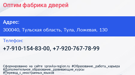 Оптим, фабрика дверей по адресу 300040, Тульская область, Тула, Ложевая, 130 в дальнейшем Организация, размещена в следующих категориях: