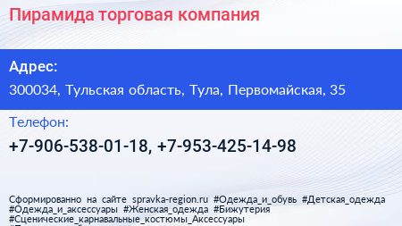 Пирамида, торговая компания по адресу 300034, Тульская область, Тула, Первомайская, 35 в дальнейшем Организация, размещена в следующих категориях: