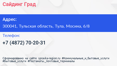 Сайдинг-Град по адресу 300041, Тульская область, Тула, Мосина, 6/8 в дальнейшем Организация, размещена в следующих категориях: