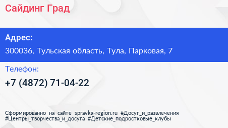 Сайдинг-Град по адресу 300036, Тульская область, Тула, Парковая, 7 в дальнейшем Организация, размещена в следующих категориях:
