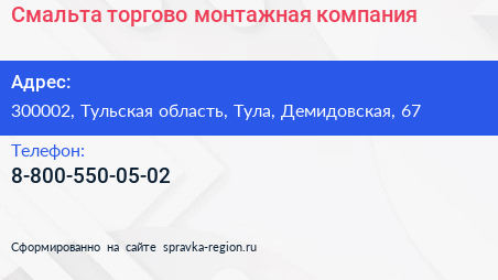 Смальта, торгово-монтажная компания по адресу 300002, Тульская область, Тула, Демидовская, 67 в дальнейшем Организация, размещена в следующих категориях: