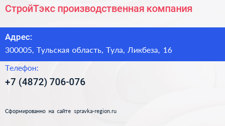СтройТэкс, производственная компания по адресу 300005, Тульская область, Тула, Ликбеза, 16 в дальнейшем Организация, размещена в следующих категориях: