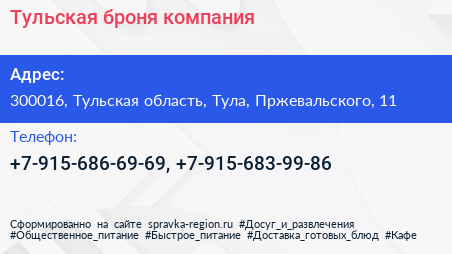 Тульская броня, компания по адресу 300016, Тульская область, Тула, Пржевальского, 11 в дальнейшем Организация, размещена в следующих категориях: