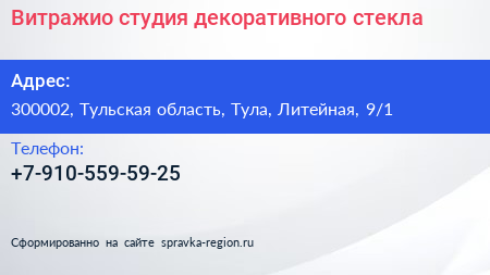 Витражио, студия декоративного стекла по адресу 300002, Тульская область, Тула, Литейная, 9/1 в дальнейшем Организация, размещена в следующих категориях: