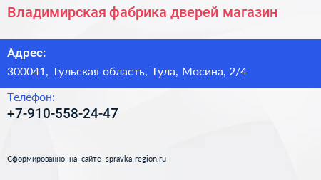 Владимирская фабрика дверей, магазин по адресу 300041, Тульская область, Тула, Мосина, 2/4 в дальнейшем Организация, размещена в следующих категориях: