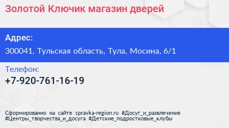 Золотой Ключик, магазин дверей по адресу 300041, Тульская область, Тула, Мосина, 6/1 в дальнейшем Организация, размещена в следующих категориях: