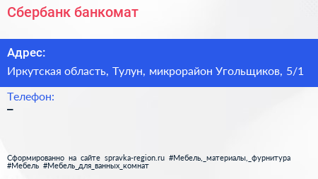 Сбербанк, банкомат по адресу Иркутская область, Тулун, микрорайон Угольщиков, 5/1 в дальнейшем Организация, размещена в следующих категориях: