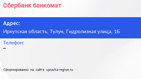 Сбербанк, банкомат по адресу Иркутская область, Тулун, Гидролизная улица, 1Б в дальнейшем Организация, размещена в следующих категориях: