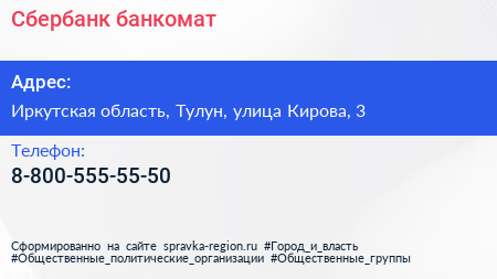 Сбербанк, банкомат по адресу Иркутская область, Тулун, улица Кирова, 3 в дальнейшем Организация, размещена в следующих категориях: