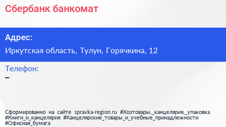Сбербанк, банкомат по адресу Иркутская область, Тулун, Горячкина, 12 в дальнейшем Организация, размещена в следующих категориях: