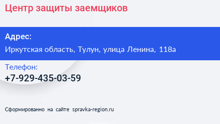 Центр защиты заемщиков по адресу Иркутская область, Тулун, улица Ленина, 118а в дальнейшем Организация, размещена в следующих категориях: