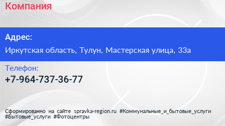 Компания по адресу Иркутская область, Тулун, Мастерская улица, 33а в дальнейшем Организация, размещена в следующих категориях:
