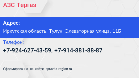 АЗС, Тергаз по адресу Иркутская область, Тулун, Элеваторная улица, 11Б в дальнейшем Организация, размещена в следующих категориях: