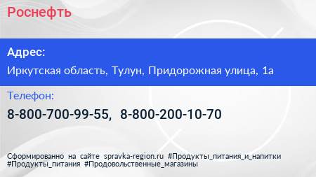 Роснефть по адресу Иркутская область, Тулун, Придорожная улица, 1а в дальнейшем Организация, размещена в следующих категориях: