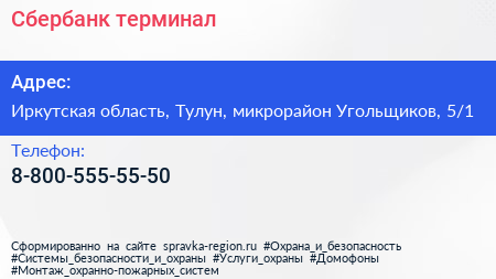 Сбербанк, терминал по адресу Иркутская область, Тулун, микрорайон Угольщиков, 5/1 в дальнейшем Организация, размещена в следующих категориях: