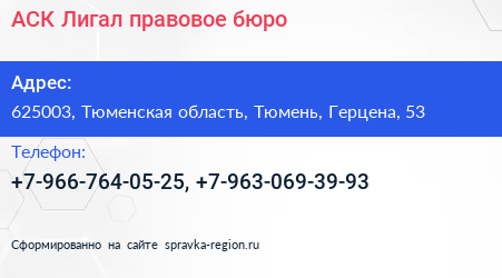 АСК Лигал, правовое бюро по адресу 625003, Тюменская область, Тюмень, Герцена, 53 в дальнейшем Организация, размещена в следующих категориях: