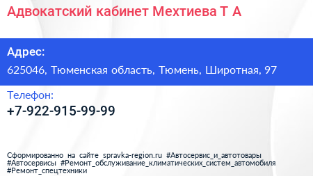 Адвокатский кабинет Мехтиева Т.А. по адресу 625046, Тюменская область, Тюмень, Широтная, 97 в дальнейшем Организация, размещена в следующих категориях: