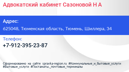 Адвокатский кабинет Сазоновой Н.А. по адресу 625048, Тюменская область, Тюмень, Шиллера, 34 в дальнейшем Организация, размещена в следующих категориях: