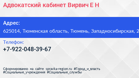 Адвокатский кабинет Вирвич Е.Н. по адресу 625014, Тюменская область, Тюмень, Западносибирская, 2 в дальнейшем Организация, размещена в следующих категориях: