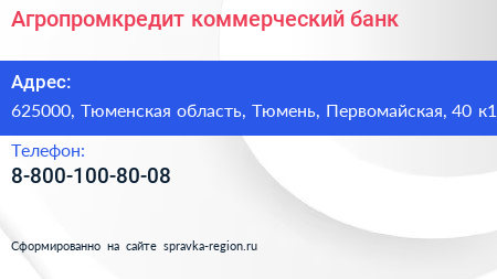 Агропромкредит, коммерческий банк по адресу 625000, Тюменская область, Тюмень, Первомайская, 40 к1 в дальнейшем Организация, размещена в следующих категориях:
