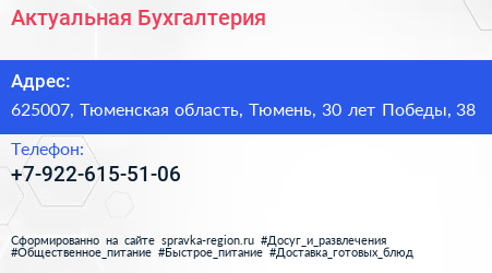 Актуальная Бухгалтерия по адресу 625007, Тюменская область, Тюмень, 30 лет Победы, 38 в дальнейшем Организация, размещена в следующих категориях: