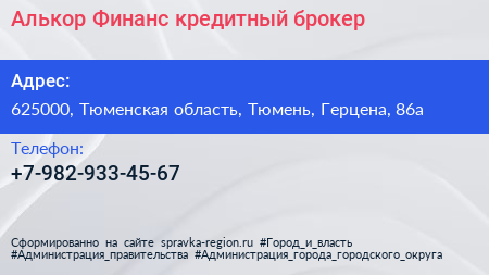 Алькор Финанс, кредитный брокер по адресу 625000, Тюменская область, Тюмень, Герцена, 86а в дальнейшем Организация, размещена в следующих категориях: