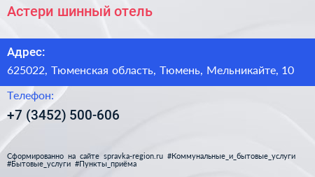 Астери, шинный отель по адресу 625022, Тюменская область, Тюмень, Мельникайте, 10 в дальнейшем Организация, размещена в следующих категориях:
