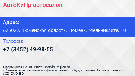 АвтоКиПр, автосалон по адресу 625022, Тюменская область, Тюмень, Мельникайте, 10 в дальнейшем Организация, размещена в следующих категориях: